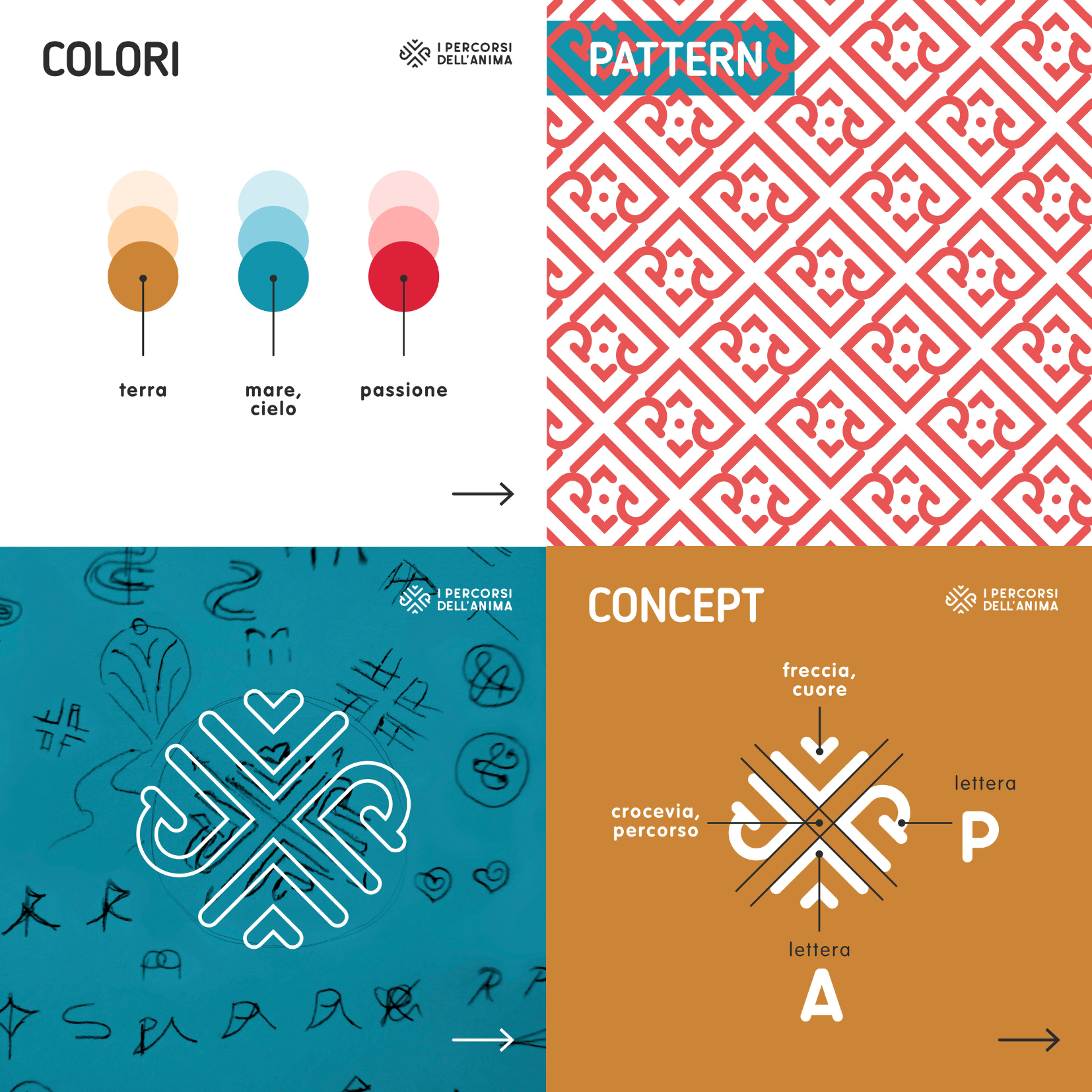Per creare quello che è il nostro marchio abbiamo scelto di integrare la lettera “P” che sta per percorsi e la lettera “A” che sta per anima all’interno del logo. L’incrocio tra le due lettere forma quello che è il crocevia che indica per l’appunto i percorsi dell’anima.